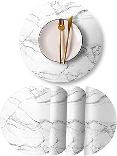 ラウンドレザープレースマット 4枚セット PU 防水 滑り止め 洗濯可能 耐熱 キッチンダイニングテーブル用 マーブルホワイト
