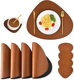 SUBEKYU フェイクレザー プレースマットとコースターセット 洗濯可能なテーブルマット 防水コーヒーマット 耐熱プレースマット キッチンダイニングテーブル用 (4点ブラウンセット)