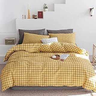 SUSYBAO 100%天然ウォッシュドコットン 掛け布団カバー3点セット (クイーン/フル) 掛け布団カバー1枚 枕カバー2枚 ホテル品質 ソフト 快適 通気性 ギンガム 格子柄 チェック柄 ジッパータイ付き クイーン イエロー SZJRQC2019061730