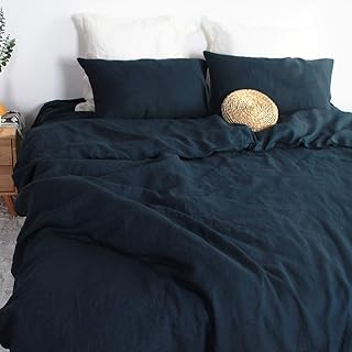 S VICTORY SYMBOL ピュアリネンキルト布団カバーセット ストーンウォッシュ寝具セット ボタン留め掛け布団カバー コーナータイ4本付き (ネイビー クイーン) ソフト 通気性 耐久性 快適