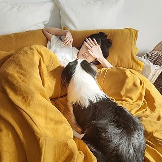 S VICTORY SYMBOL ピュアリネンキルト布団カバーセット ストーンウォッシュ寝具セット ボタン留め掛け布団カバー コーナータイ4本(イエロー、クイーン)、ソフト、通気性、耐久性、快適
