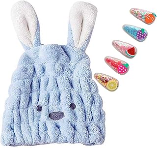 ヘアキャップ 速乾 うさぎ かわいい タオルキャップ 吸水タオル ヘアバンド お風呂上り ターバン 子供 女の子 大人 吸水 やわらか 速乾 マイクロファイバー タオル ドライキャップ タオルドライ ヘアターバン (ウサギー ブルー + キッズ ヘアピン 5点付き)