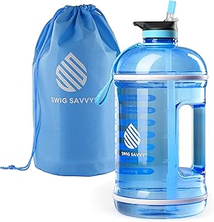 Swig Savvy モチベーションを上げるウォーターボトル ストロー付きウォータートラッカーボトル 時間マーカー付き 漏れ防止 BPAフリー プラスチック 1L (33オンス) (ブルー)